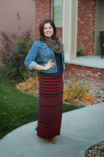 Since Thanksgiving is almost here, Chelsea and I decided to take it on. You know what that means? No, I'm not talking about Black Friday shopping, though that is fun. I'm talking about Thanksgiving Dinner and the need for comfy clothes. Enter my maxi dress, it feels like pajamas, but looks like actual clothes. Nice! I decided to try it as a skirt and love the result.It was pretty easy to throw a fitted tee over my dress, then I added a denim jacket and fun infinity scarf. I'm now official convinced that maxi skirts aren't only for warm weather, and I'm now on the hunt for one like this. To me, this will be the perfect Thanksgiving look, with plenty of room for turkey and all the other goodness my mom, sister, and husband will bring to the table....I don't so much cook....